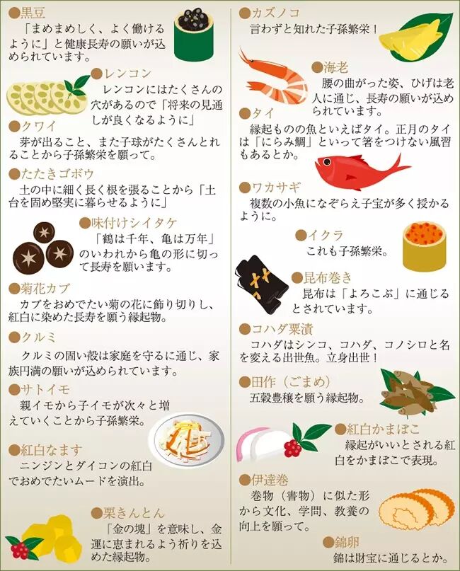「おせち」所包含的食材种类丰富,相对其他传统日式料理,量也够大,不过:我们南方灌香肠,味道可能各家不太一样,但是基本都用猪肉;咱们北方包饺子,随自家喜好做馅儿,但都是用小麦面做皮。同理,「おせち」的食材,即便搭配出百种花样,但一定会包含以下基本食材。