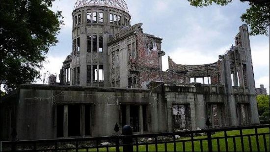 在广岛原子弹爆炸遗址的纪念中心是一座废弃的建筑,当年爆炸就发生在建筑上空600米,当年建筑里的人都立即死亡,但建筑的框架却保留了下来,现在白骨一样的建筑空壳中,只有青青的绿草算是生命的象征。