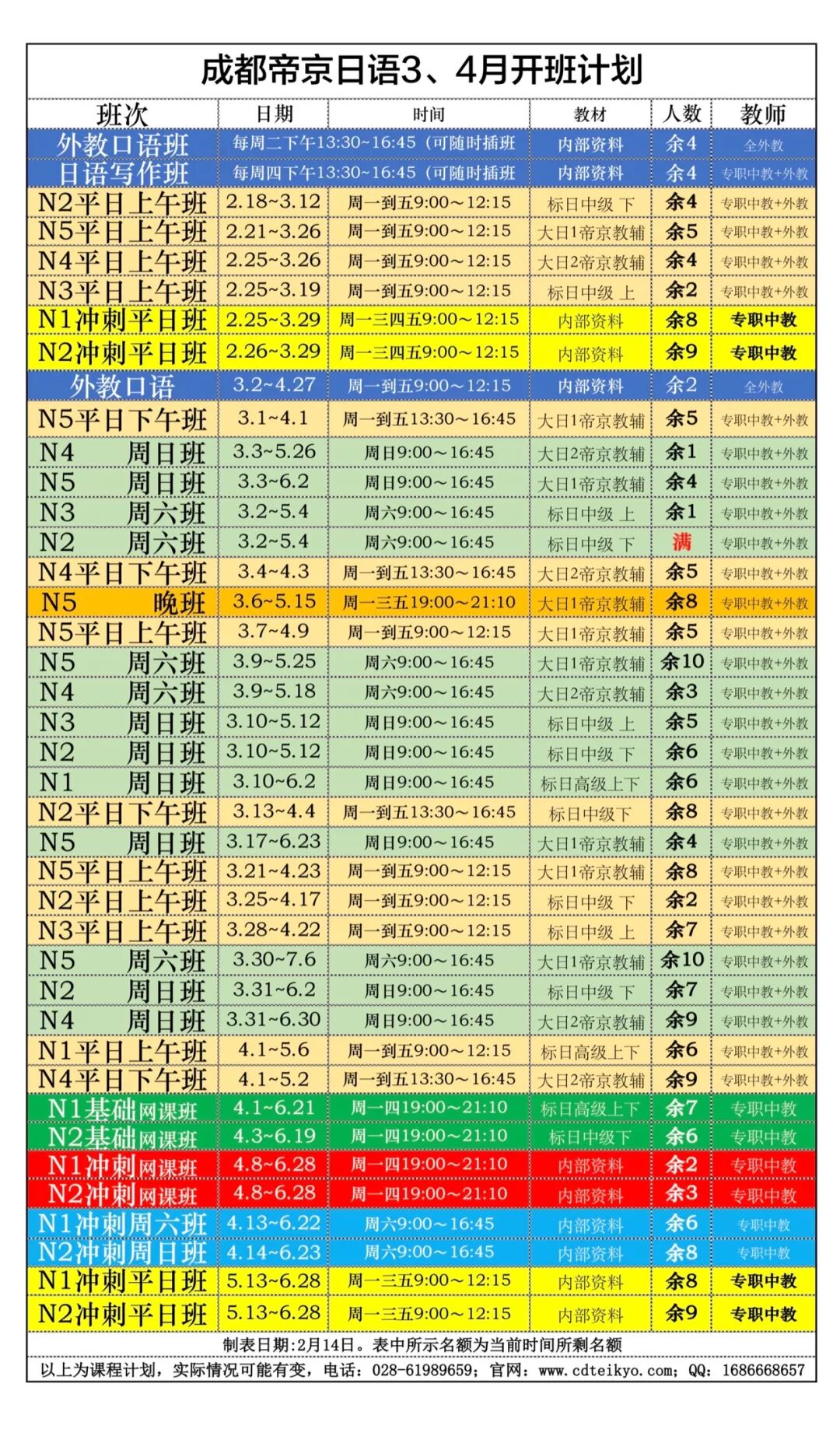 外教口语班 目标: 由学生和外教制定会话场景,外教引导学生开口说日语。全程外教日语上课,有不懂的地方外教给予中文解释。目标力求强化学生的听力以及口语水平。 上课内容介绍: 用日语进行简单的见面寒暄、自我介绍、引荐朋友、送礼、购物、查询电话号码、问路、邀约朋友、拒绝朋友邀请、简单的寄送包裹、描述节日庆典、餐厅AA制吃饭、坐出租车、问朋友家人情况、ATM取钱、医院看病、聊自己兴趣爱好、酒会交往、表达观点、租房子、求帮助、写日记、离别寒暄等。 32课时,2580元(两个月) *此班可随时插班,如需在其他指定时间开班,需满4人以上方可开班。