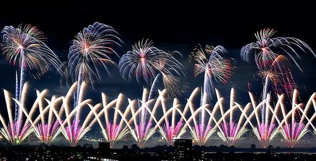 如今的日本三大烟花大会分别是:茨城县的土浦全国花火竞技大会(以下简称土浦花火大会)、秋田县的大曲全国花火竞技大会以及新泻县的长冈节大烟花大会。