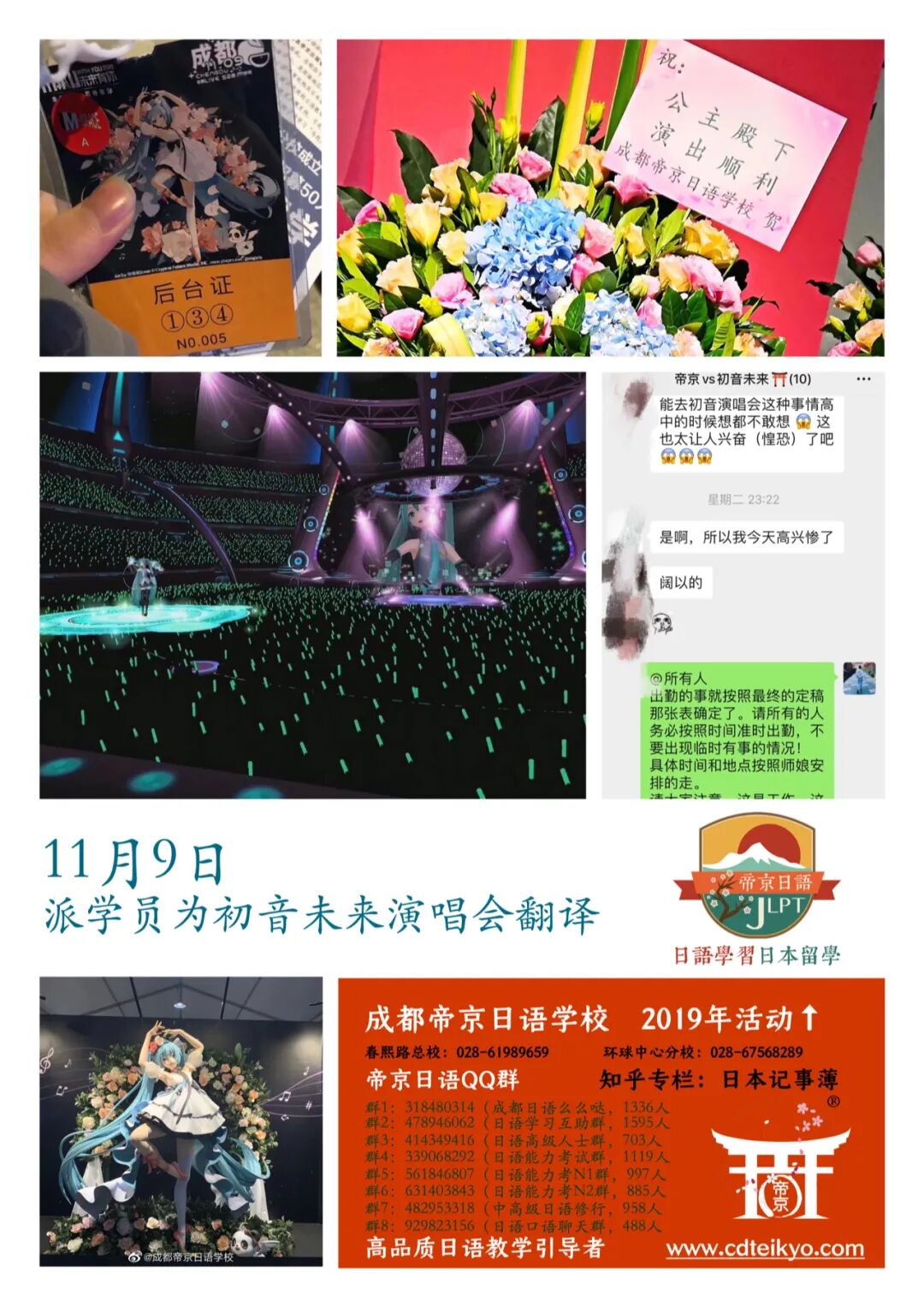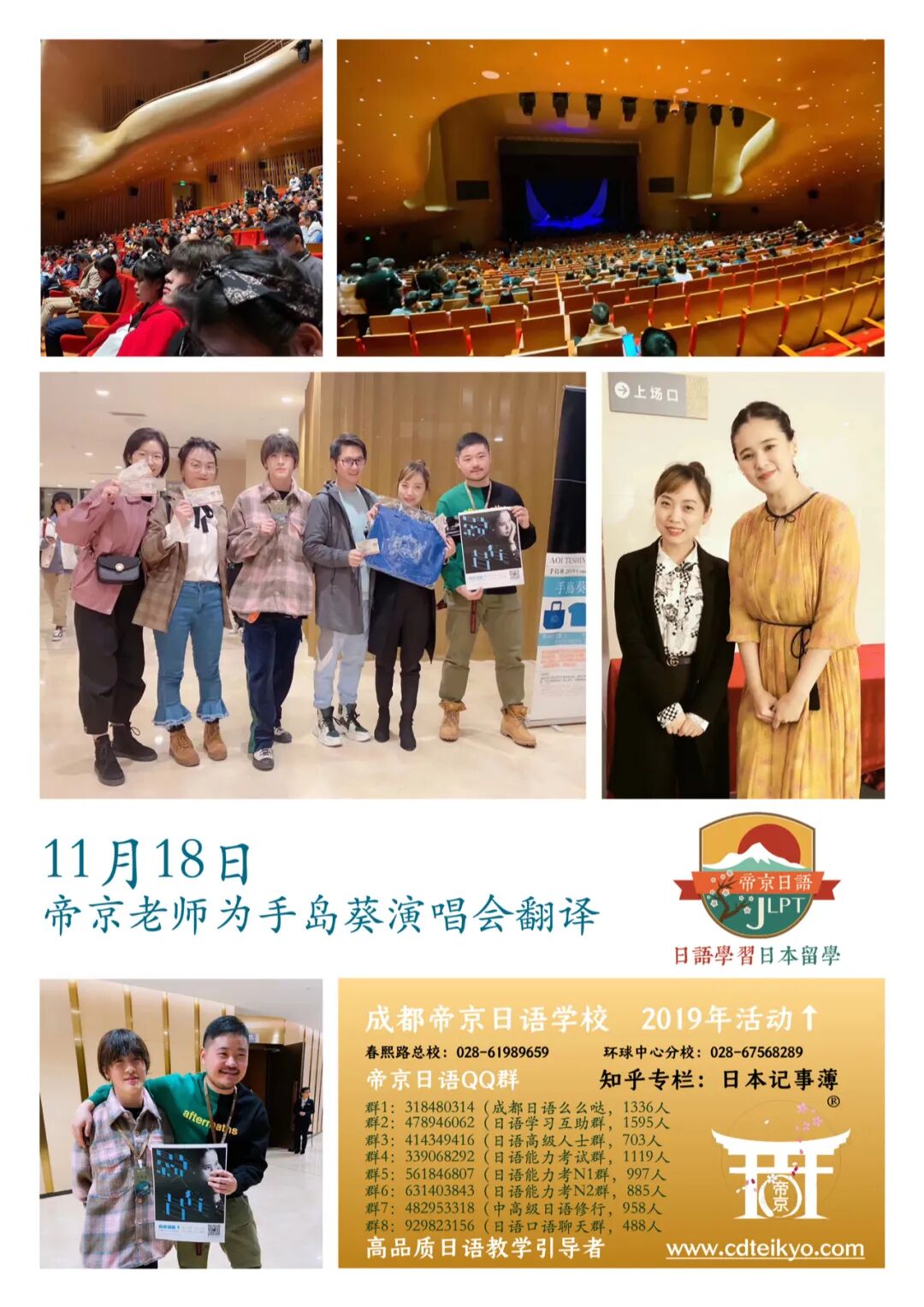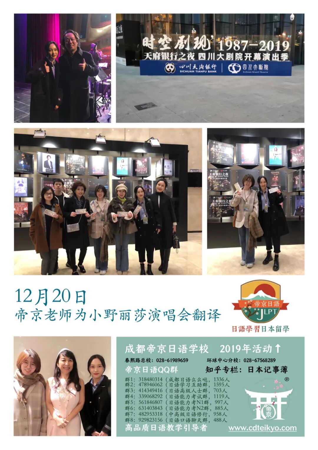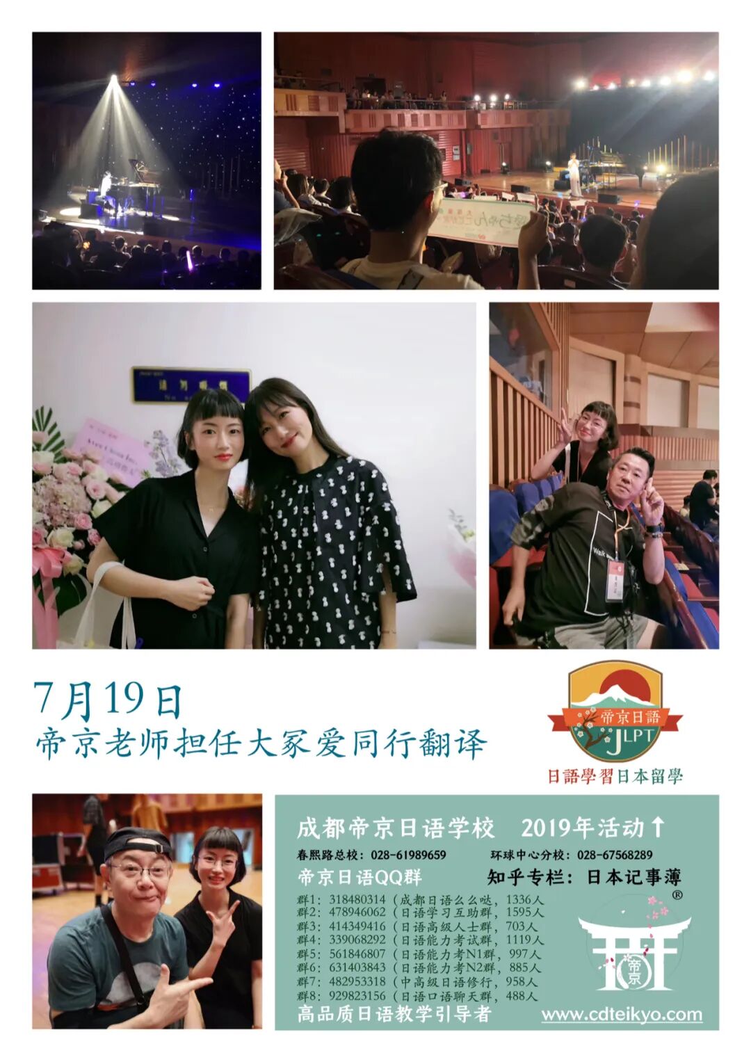 在2019年期间:帝京日语为日本明星来蓉演唱会担任翻译5次(hyde、小野丽莎、大冢爱、手岛葵、初音未来)。