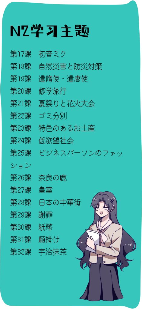 会了解到的日本文化:复合词、城下町、本三大夜景、日本的CM、日本报纸、日本赏樱花、樱花前线、日本机器人发展、花粉症、芥川龙之介、《蜘蛛丝》等。