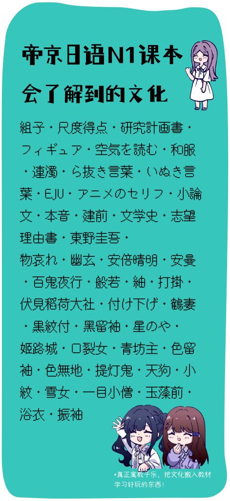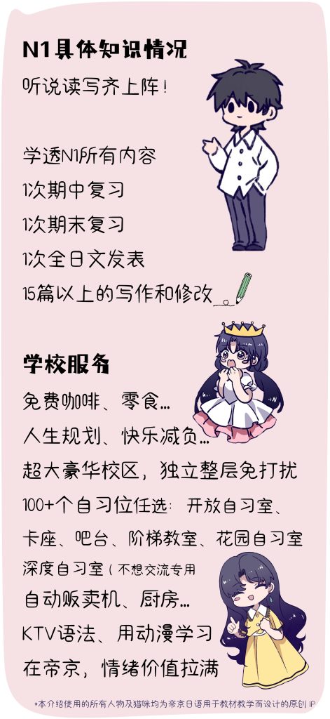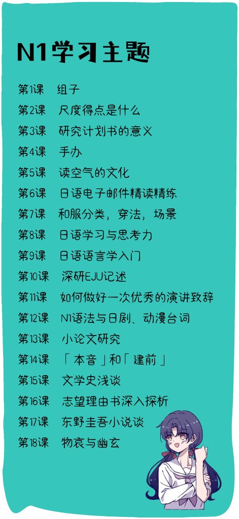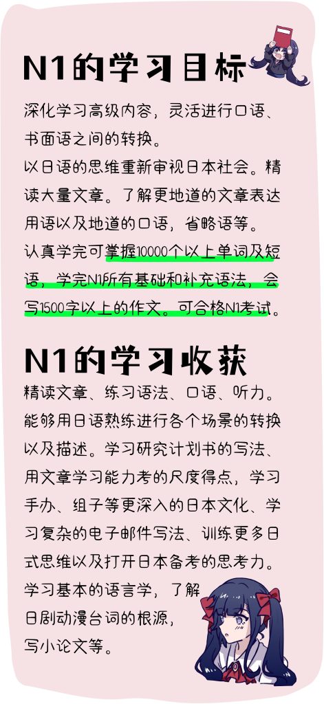 目标:深化学习高级内容,灵活进行口语、书面语之间的转换。以日语的思维重新审视日本社会。了解更地道的文章表达用语以及地道的口语,省略语等。认真学完可合格N1考试。