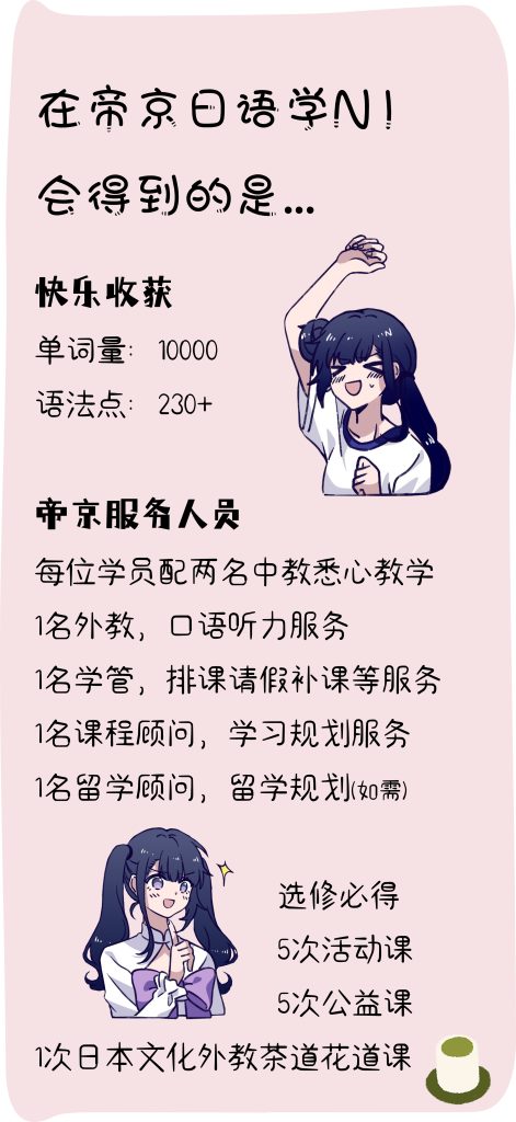 收获:学完以后掌握10000个以上单词及短语,学完N1所有基础和补充语法,精读多篇文章,会写1500字以上的作文。能够用日语熟练进行各个场景的转换以及描述。*把该背的单词背了才行哟!