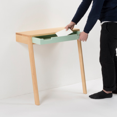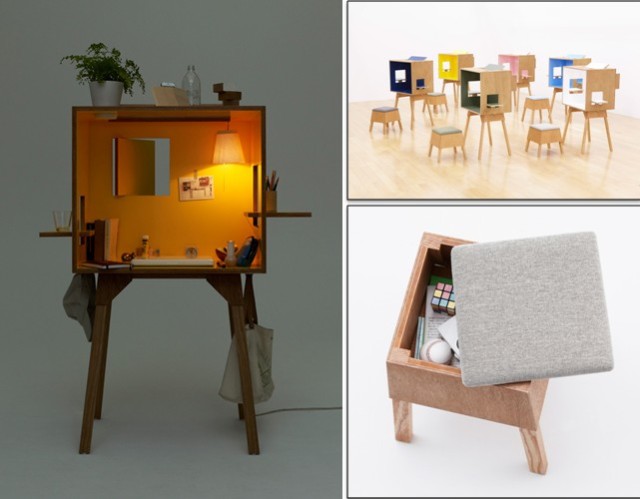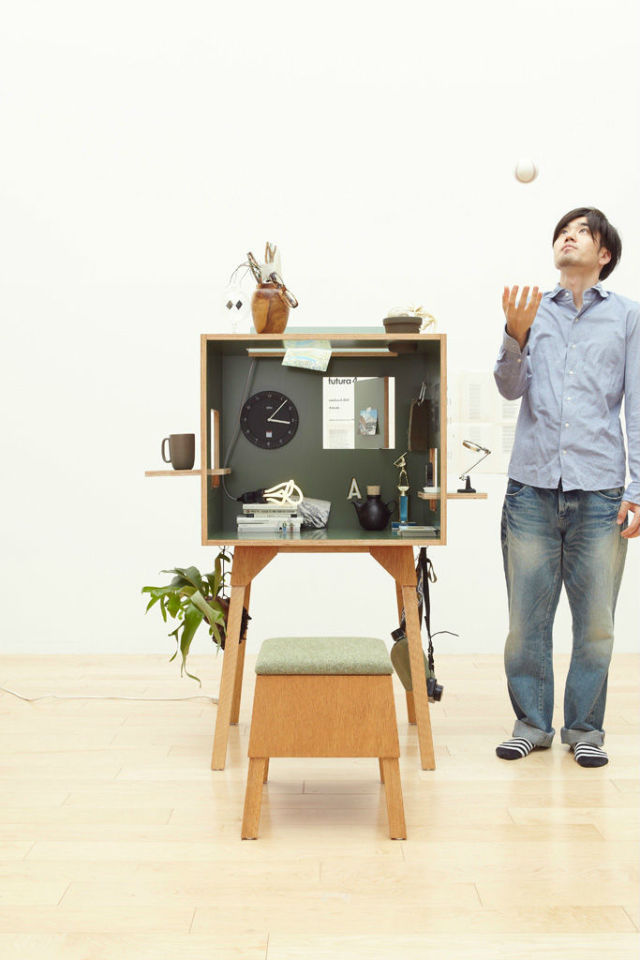 这款工作桌在一个五面的箱体中,几乎发挥了工作室的功能,独立的个体具有隔间的效果,让人可以专心地投入工作,四边的开口有点类似窗户,同时也能摆放一些零碎的小东西,就连立面空间也能好好利用,包括摆放挂钟、黏贴备忘事项,或是风格布置等等,每一处空间都不浪费。