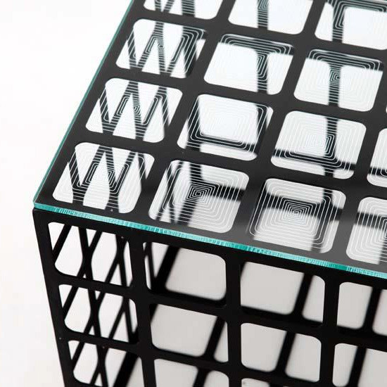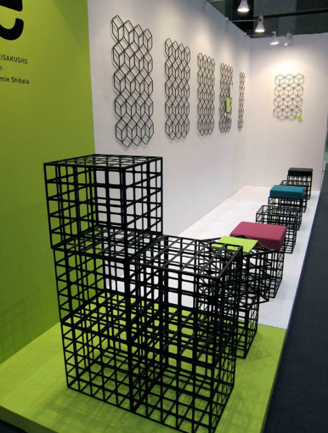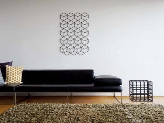 该系列产品包括了墙上挂着的几何网格等一系列的立方体,可堆叠,也可单一使用,铺上垫子就可以当凳子使用。黑色的钢铁材质,几何的设计造型,塑造出一种神秘的简约风格。