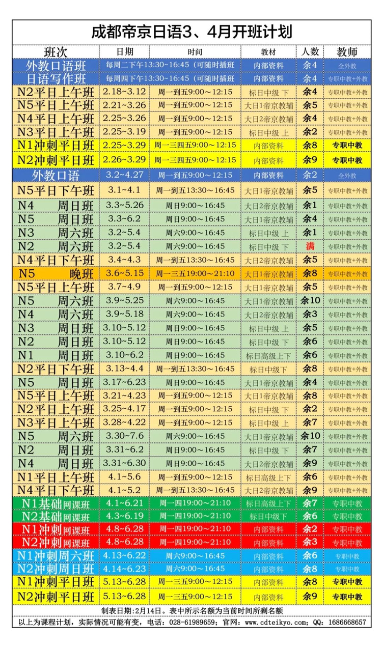 外教口语班 目标: 由学生和外教制定会话场景,外教引导学生开口说日语。全程外教日语上课,有不懂的地方外教给予中文解释。目标力求强化学生的听力以及口语水平。 上课内容介绍: 用日语进行简单的见面寒暄、自我介绍、引荐朋友、送礼、购物、查询电话号码、问路、邀约朋友、拒绝朋友邀请、简单的寄送包裹、描述节日庆典、餐厅AA制吃饭、坐出租车、问朋友家人情况、ATM取钱、医院看病、聊自己兴趣爱好、酒会交往、表达观点、租房子、求帮助、写日记、离别寒暄等。 32课时,2580元(两个月) *此班可随时插班,如需在其他指定时间开班,需满4人以上方可开班。