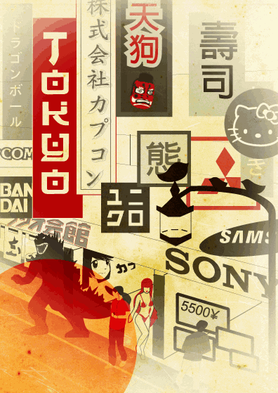 在这些专题中,最值得一提的是东京专题,专题征集的全是gif动态图片,设计师们用色彩斑斓的霓虹,秀色可餐的女优,动感十足的漫画,或秀气或粗犷的汉字诉说着艺术家眼中不一样的迷幻东京……来体验一下吧~图片不大,不用担心流量哈!