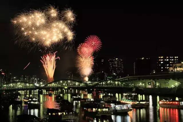 每年7月最后一个星期六的晚上,数万发造型各异的烟花将东京湾的隅田川周边的夜空点缀得绚烂无比,这就是东京具有代表性的烟花大会隅田川花火大会。
