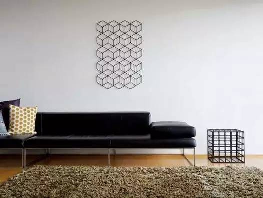 该系列产品包括了墙上挂着的几何网格等一系列的立方体,可堆叠,也可单一使用,铺上垫子就可以当凳子使用。黑色的钢铁材质,几何的设计造型,塑造出一种神秘的简约风格。