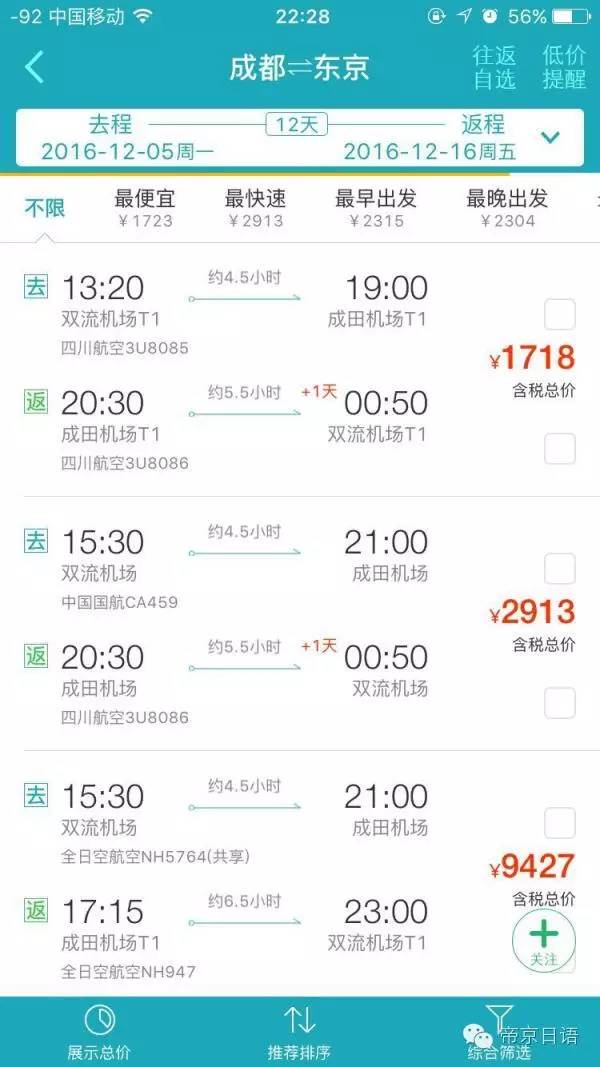 机票尽量控制在3000以内,活用app,经常查起走,一般提前两个月左右,可以以3000左右的价格买到全日空往返东京的票,当然,既然决定了要去的日本的话肯定是提前定,那么一定会买到便宜的,一两千都说不定,国航川航的航线就更便宜了,最近川航这个航线极其便宜,而且时间非常合适,回国当天东京是晚上才发车,比起白天的航班,相当于还可以在东京多玩一天。大家可以多关注这趟。如下图,才一千多!!如果是春秋航空什么的那种廉价航空公司的票的话就更便宜了。当然代价可能是转机要很久什么的~