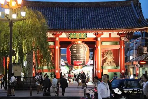 是浅草寺入口的大门,几经火灾焚毁,后于1960年重建。雷门正门入口处左右威风凛凛的风神和雷神二将,镇守着浅草寺。雷门相当于金龙山浅草寺的总门,红漆八脚门是典型的宽边瓦顶。被称为风神雷神门,对象着门安置在右边的是风神像,左边的是雷神像。雷门最著名的要数门前悬挂的那盏巨大的灯笼,高3.3 米,重达100公斤。远远可见黑底白边的“雷门”二字,赫然醒目,着实为浅草寺增添不少气派。作为了解日本民族文化的旅游名胜,来自世界各国的游客,络绎不绝。