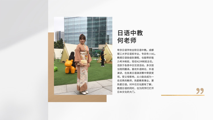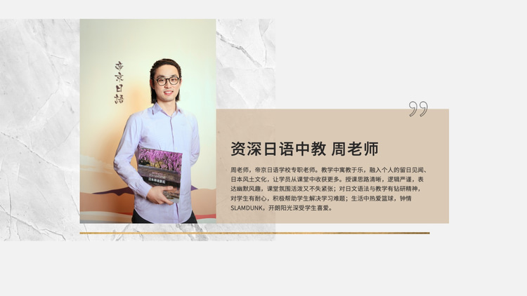 东京某设计公司社长,因为喜欢中国文化辞职来中国。成都最好的日语外教了,上过他的课的小伙伴都喜欢他。